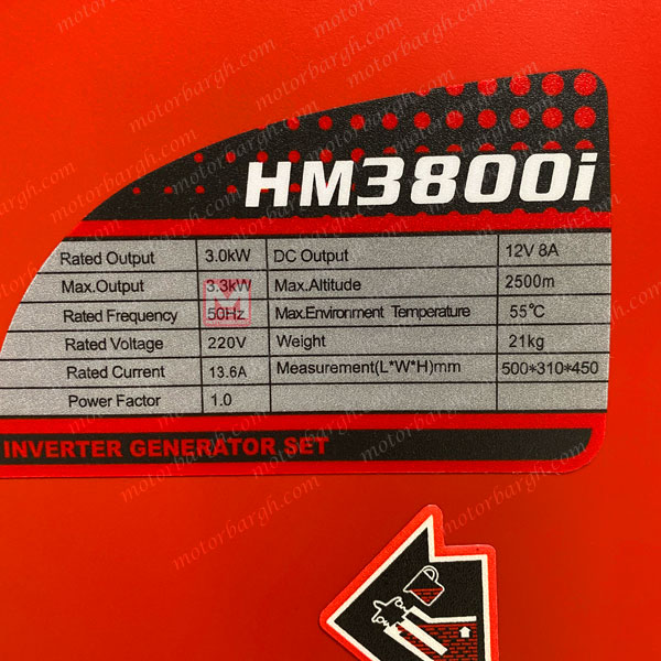 موتور برق هونامیک 3800 مجهز به برد اینورتر معروف به موتور برق سایلنت با صدای تولیدی بسیار پایین و توان ماکسیمم 3.3 کیلو وات و توان دائم 3 کیلو وات می باشد. نمایشگر این موتور برق بنزینی دیجیتال و به روش هندلی راه اندازی می شود.
