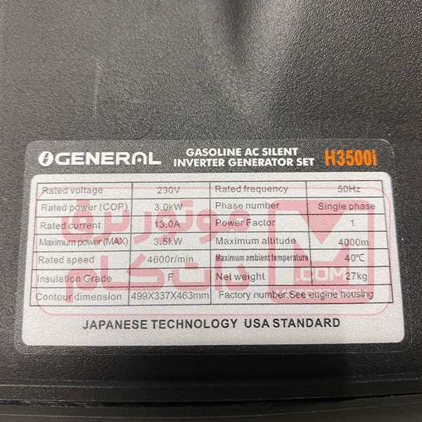 موتور برق سایلنت اینورتری اُجنرال مدل H3500i | توان ماکزیمم ۳.۵ کیلووات، توان دائم حدود ۳ کیلووات |