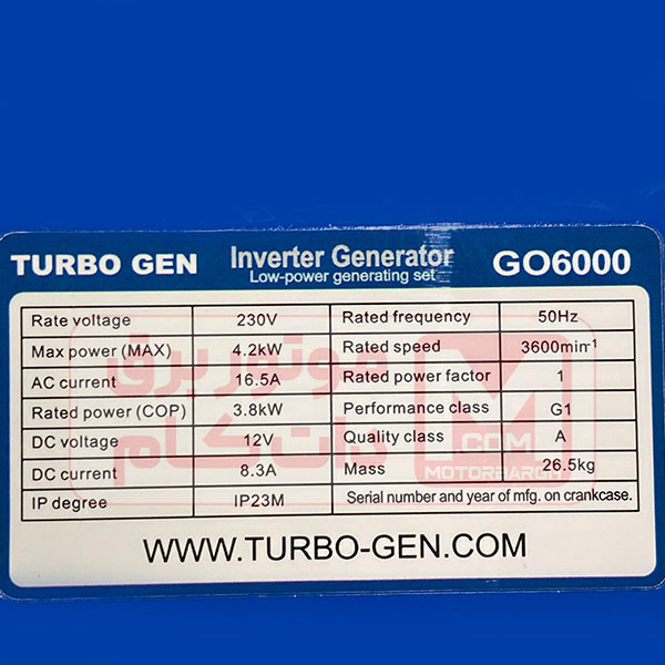 موتور برق اوپن فریم اینورتری توربوژن ۴.۲ کیلووات مدل GO6000 | توان ماکسیمم ۴.۲ کیلووات، توان دائم حدود ۳.۸ کیلووات |